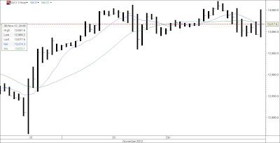 DOW day now. The dots on the line are the daily closing points. DOW's close was just - for the second day - below the falling 34 MA. The rising 8 MA will continue up but will already on Tuesday lose strength. If the MA does not cross the 34 MA but turn down below it the upside correction is over and a sharp drop will occur. This coming week might be choppy like last week , see the 1 hour chart below. If Dow chooses upside the main R lines are at 13.036.9 and 13.093.1.